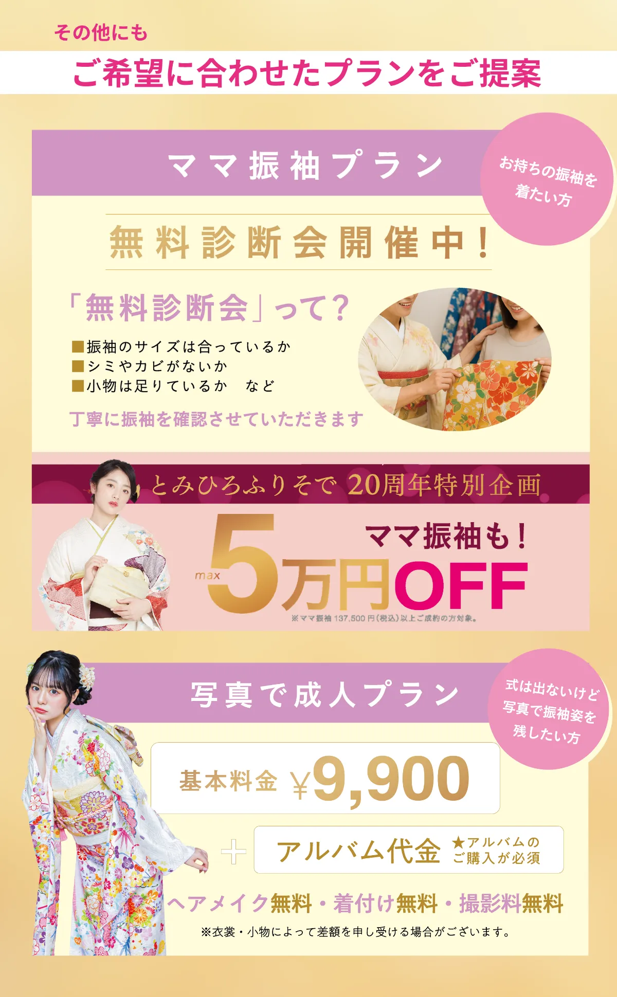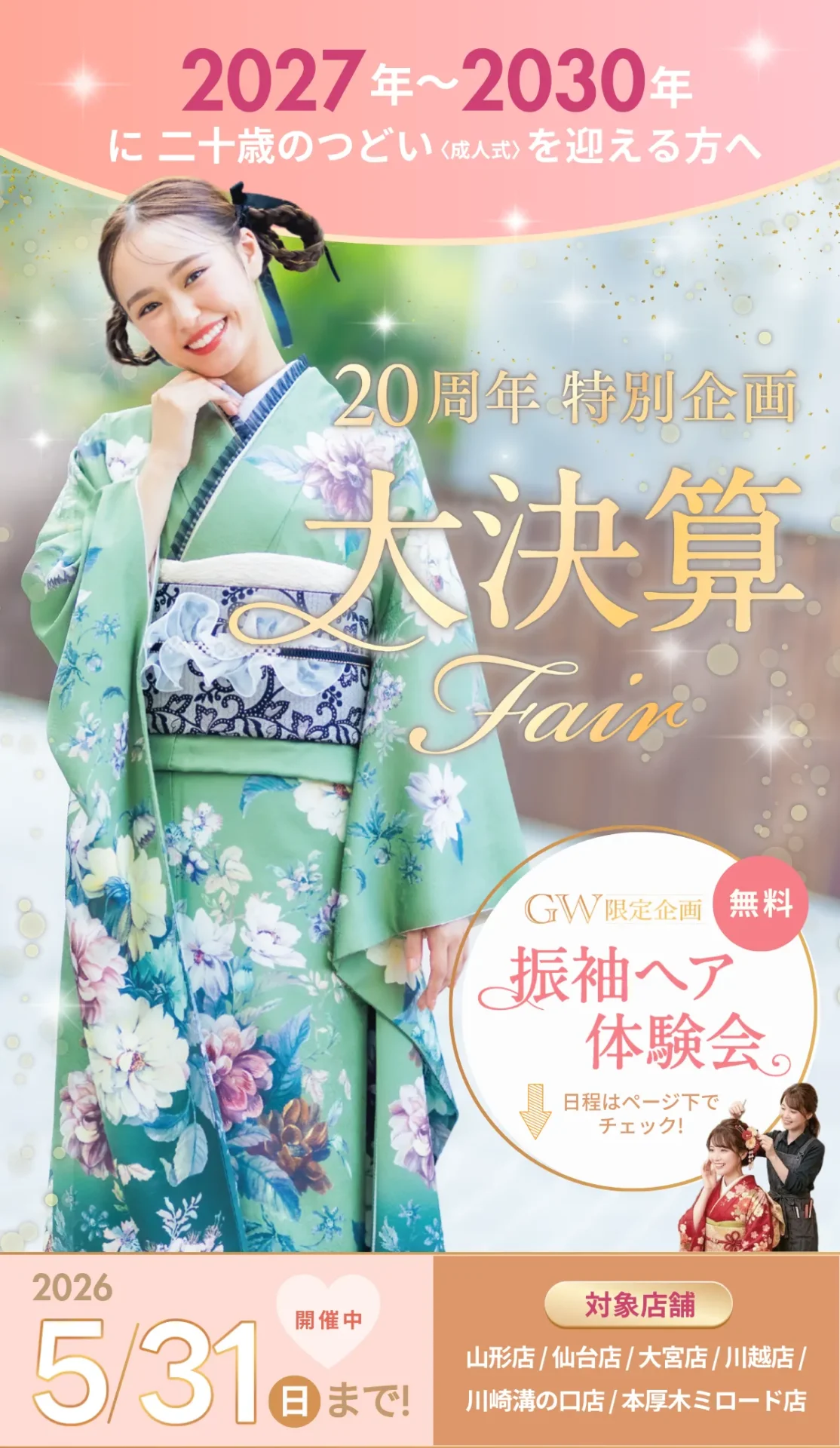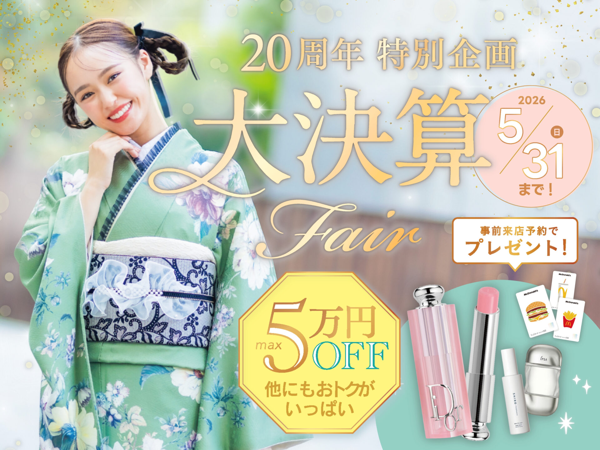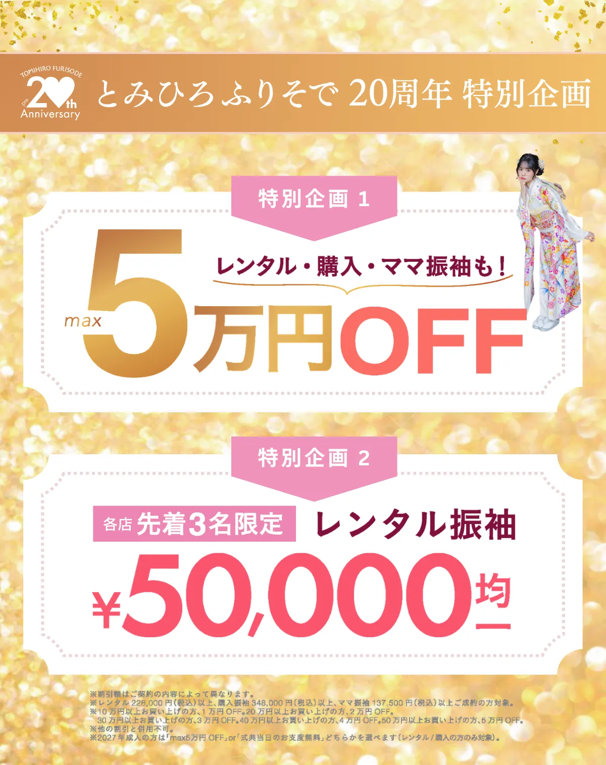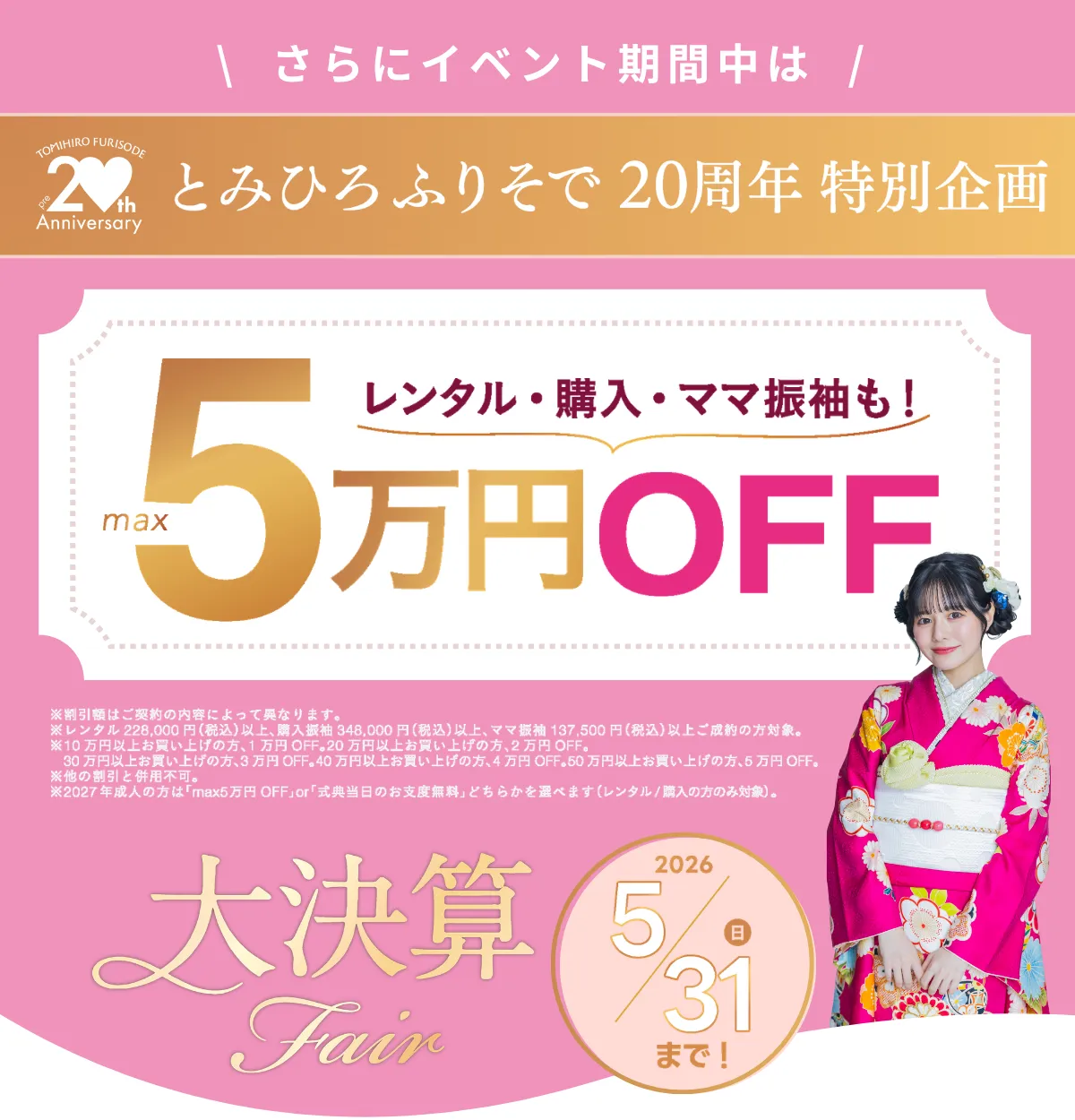 【20周年特別企画】「大決算フェア 2026」|とみひろふりそで |成人式振袖レンタル とみひろふりそで